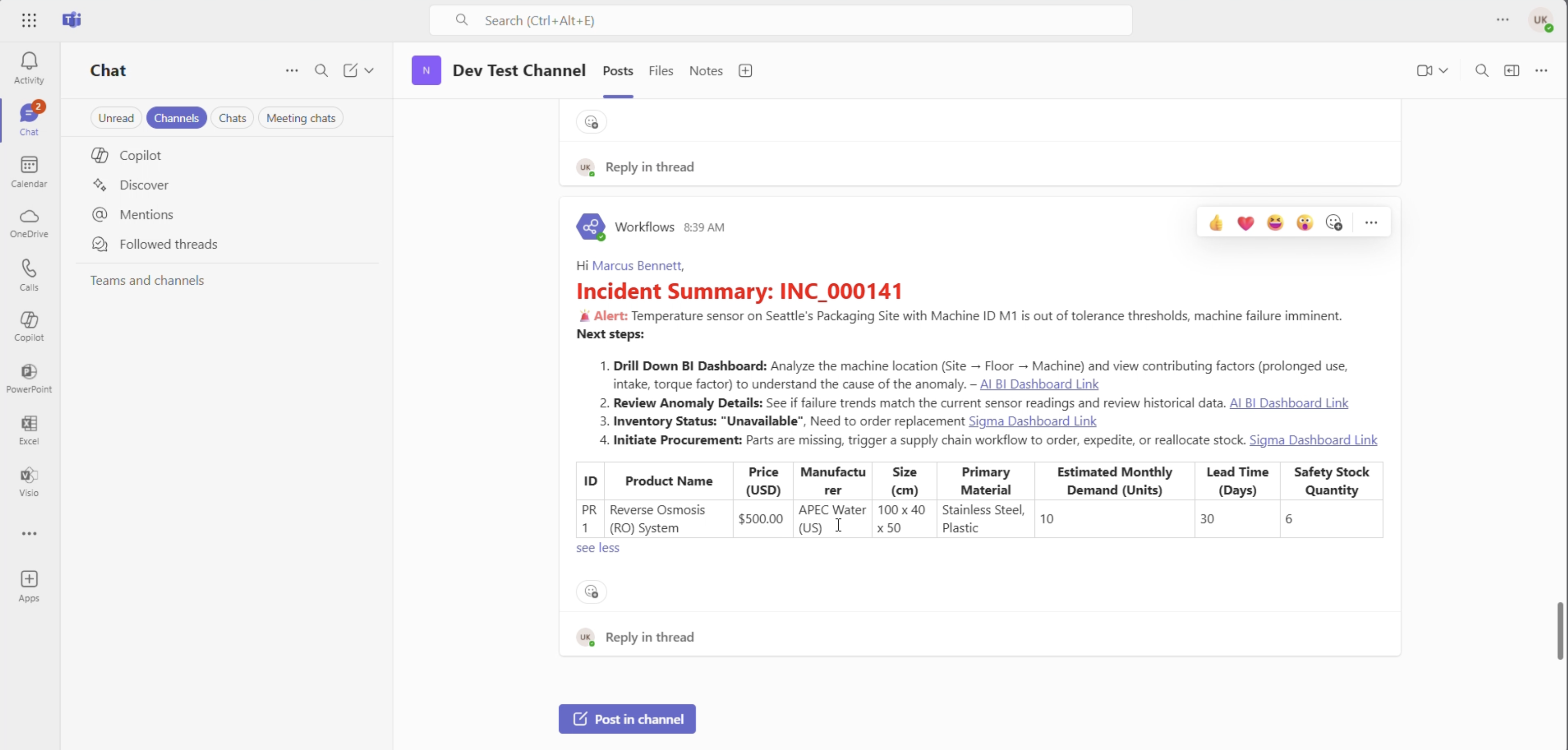 Immediately, a real-time alert is sent to Microsoft Teams, notifying the maintenance team with the recommended next action: “Maintenance is indicated.” Alongside this alert, Agent Bricks provides context-aware guidance, pulling step-by-step instructions from internal SOPs, manuals, and troubleshooting documents.