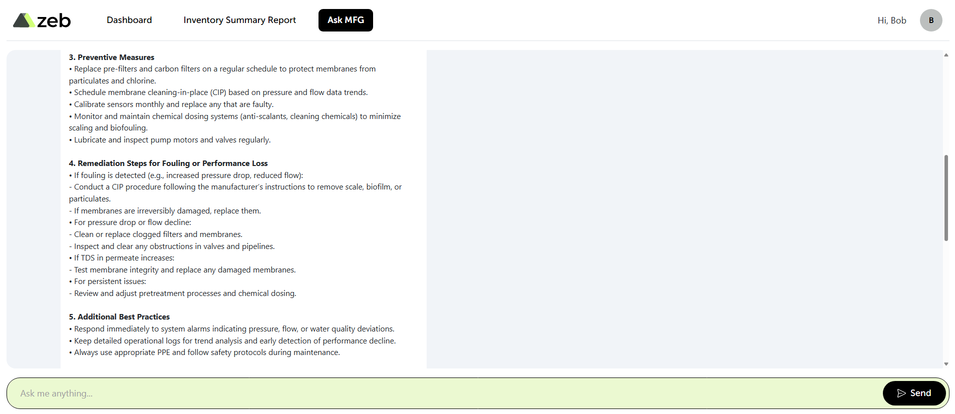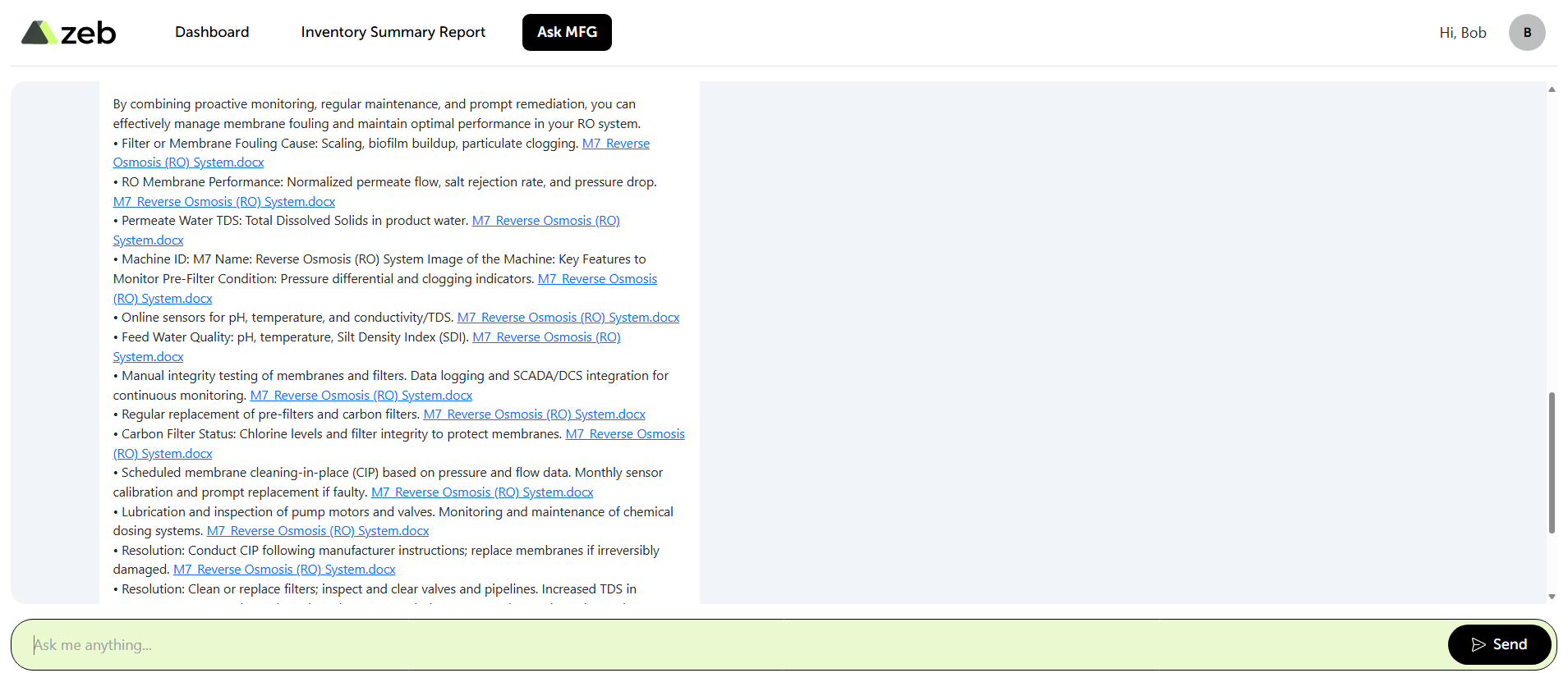 • Seamless Scaling As new machinery, sensors, and production lines are added, the system updates insights automatically. Maintenance guides and SOPs are refreshed with new uploads; no code changes required.