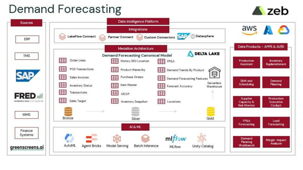 The accelerator brings together historical demand, live order intake, production telemetry, and external market indicators into a single Lakehouse architecture. ERP systems, CRM pipelines, MES data, and third-party APIs are integrated through governed ingestion pipelines, ensuring planners work from a consistent and trusted demand baseline.