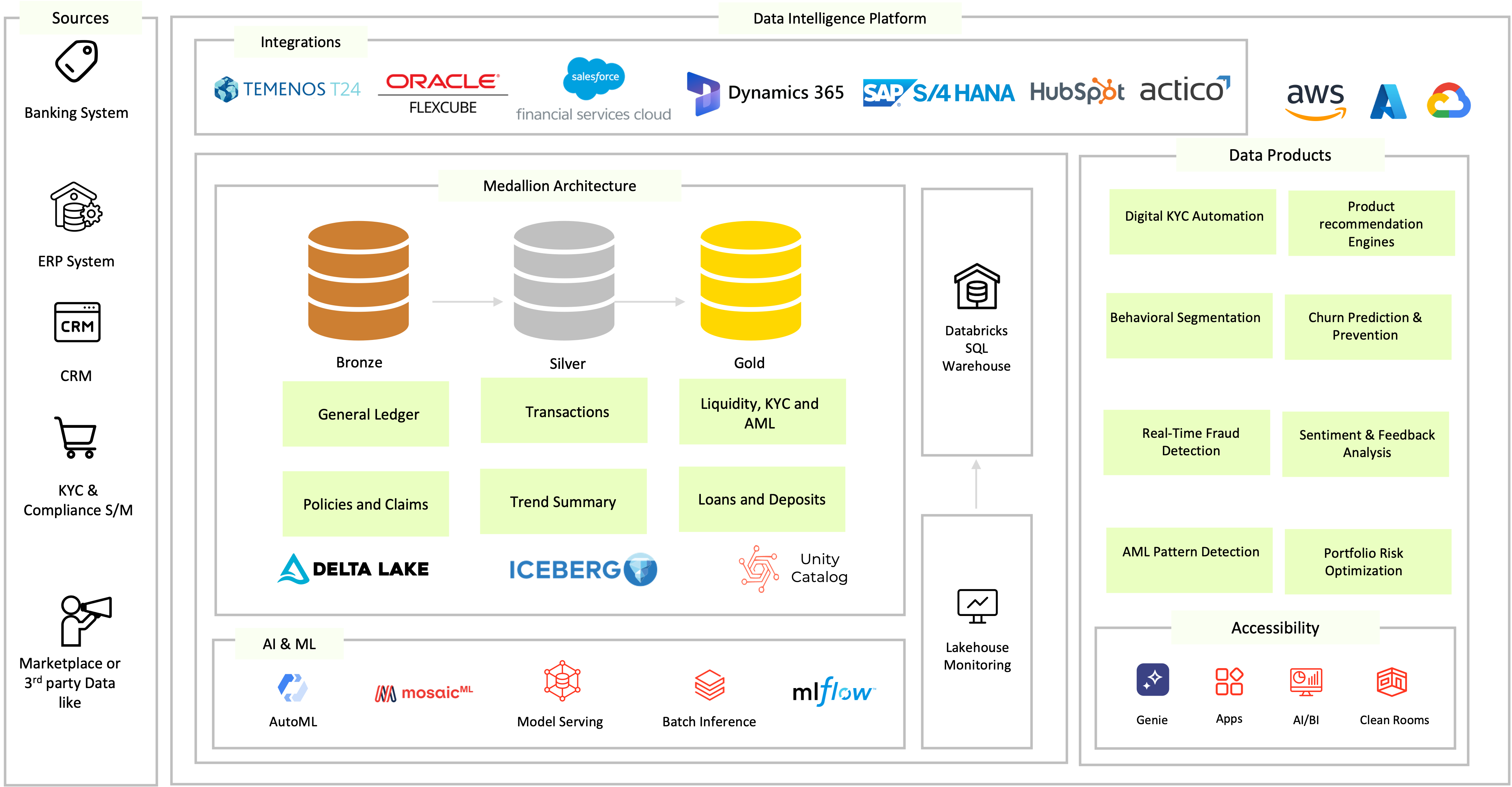 Integrates multiple sources transactions, CRM, credit profiles, and digital interactions into a single, real-time customer view in Databricks.