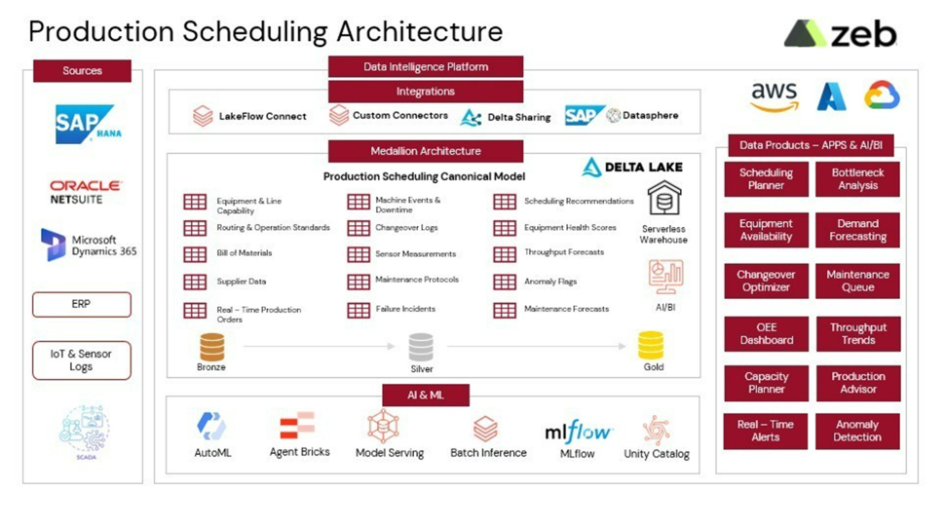 To address these challenges, zeb built the Production Scheduling Brickbuilder Accelerator, powered by the Databricks Data Intelligence Platform. The accelerator combines real-time operational technology data, predictive intelligence, and AI-assisted scheduling to transform fragmented production inputs into a governed, adaptive scheduling foundation, without heavy manual effort.