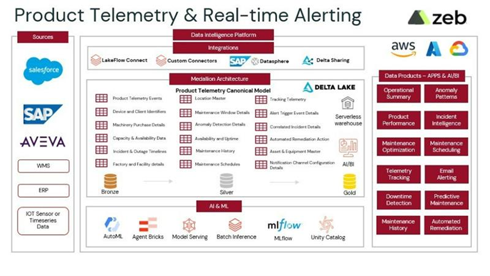 To address this challenge, zeb developed an AI-driven Product Telemetry & Real-Time Alerting solution powered by the Databricks Data Intelligence Platform. The solution provides manufacturers with real-time operational awareness by unifying streaming telemetry, applying ML-driven anomaly detection, and delivering actionable insights across production, quality, and supply chain teams.