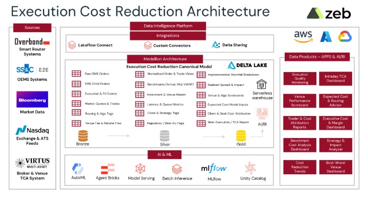 - Data Ingestion (Bronze Layer): Streaming parent and child orders, fills, quotes, routing metadata, fees, and risk flags from OMS, EMS, routers, and venues.
