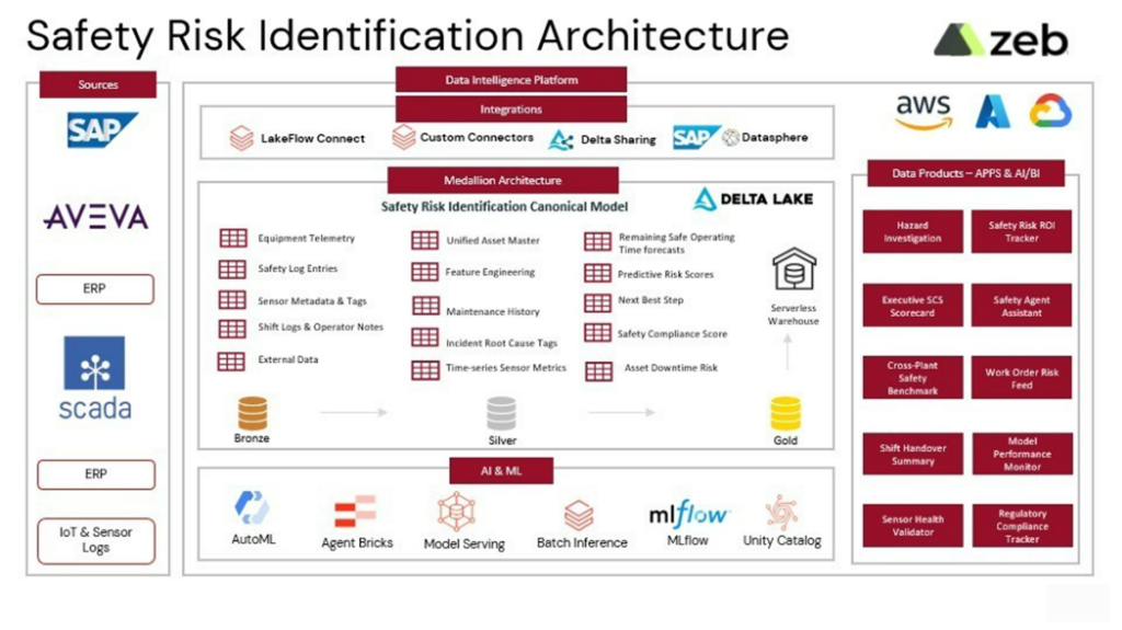 To address this, zeb built the Industrial AI-powered Safety Risk Identification solution on the Databricks Data Intelligence Platform. It combines real-time data processing, predictive machine learning, and GenAI-driven assistance to help manufacturers detect risks early, act faster, and maintain a governed safety intelligence foundation across all plants.